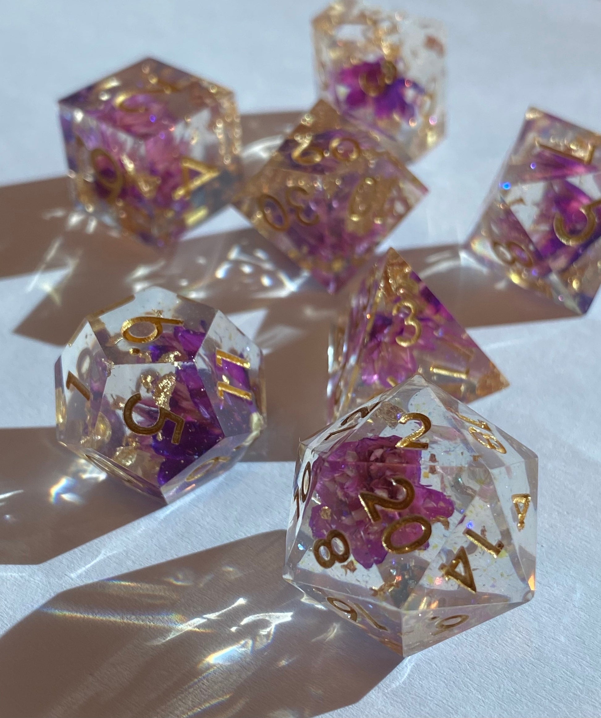 Ceremony - Glittering Clear Sharp Edge 7 Piece Dice Set - Purple Flowers and Gold Leaf With Violet Prismatic Glitter- DnD, TTRPGs
